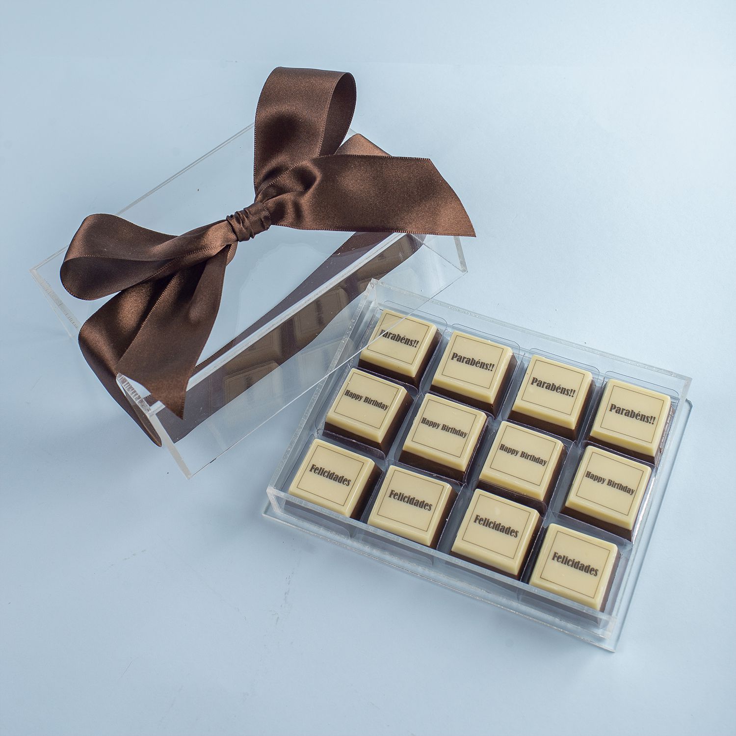 12 Chocolates Crocantes Design "Parabéns" em diversas línguas.