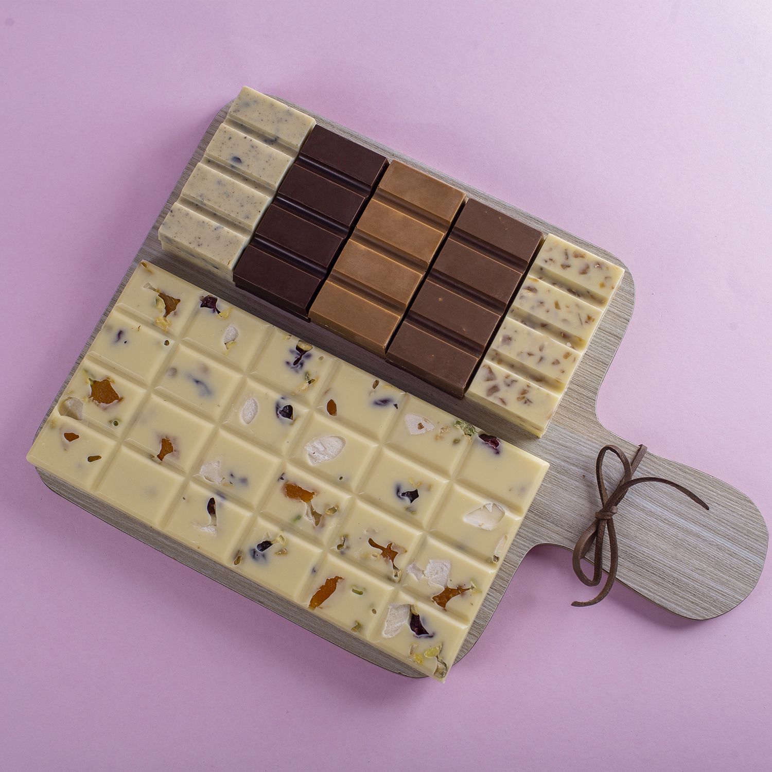 Barra de Chocolate Branco com Frutas Secas e 10 Barrinhas nos Sabores: Choc Branco com Cookie, Caramelo Flor de Sal, Choc Branco Crocante, 70% cacau • 470gr