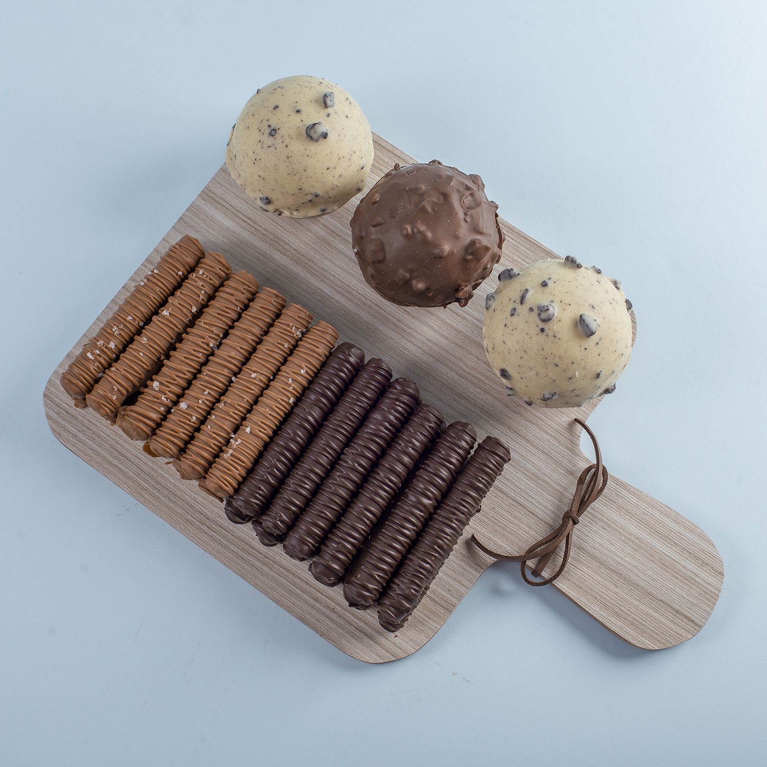 2 Trufas Cookies com Nutella, 1 Trufa Chocolate ao Leite e 24 Tubetes Caramelo Flor de Sal e 70% cacau