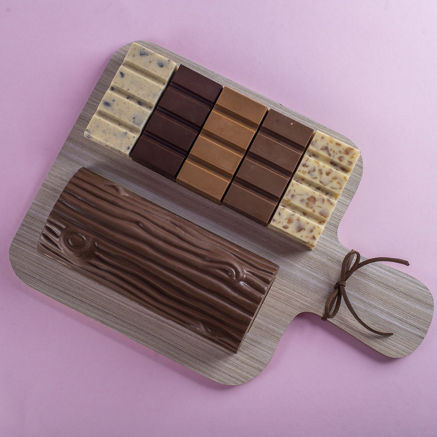 Chocolate Belga em formato de Tronco e recheio de Gianduia e Crispy Belga,